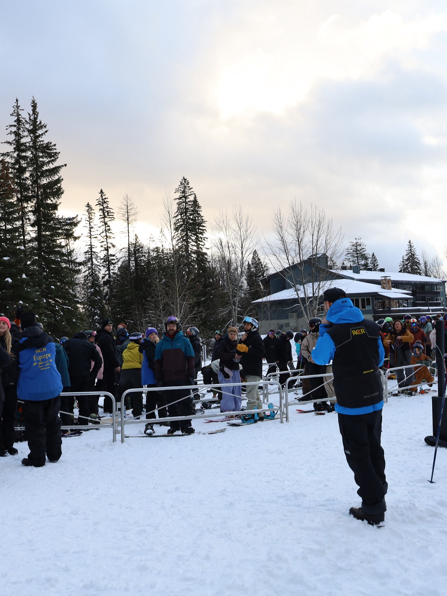 Opening day line up on the Griz Chair just outside the Griz Inn – Photo: Fernie Alpine Resort